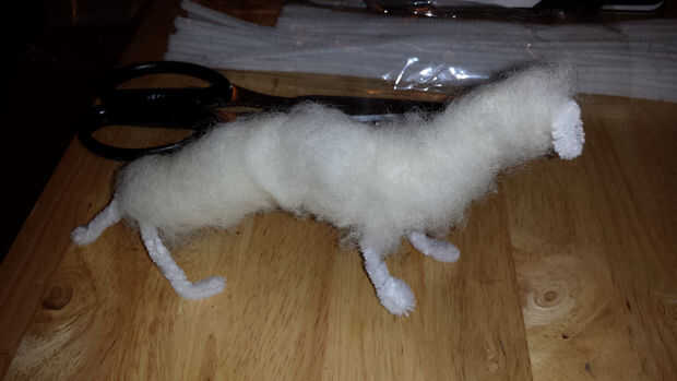 Uso áspero "lana mecha" para el cuerpo y una aguja de fieltro grueso (36 o 38) al principio y fieltro hasta que tenga una forma áspera y se mantiene su propia (como en la imagen). No la pierna completa, sólo el superior "músculo", ya que puede enrollar encima de ser a la grasa una vez que las capas de lana merina suave en.