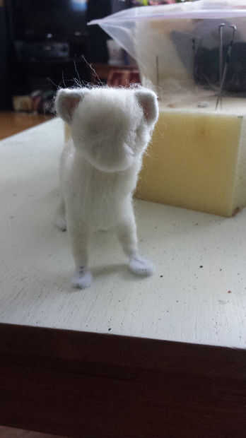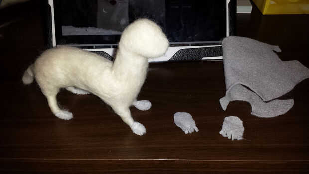 Para crear orejas cortadas la forma áspera de plano fieltro tela y fray los extremos con unas tijeras. Envuélvalos en el tono adecuado itinerante dejando la carga expuesta. Sentía la mecha en el oído utilizando una aguja 42 y sentía las orejas sobre la cabeza de su animal en la refriega. Utilice merino itinerante para mezclar en la cabeza y la forma adecuada, asegurándose de que la dirección de los flujos de la lana en el cuello.