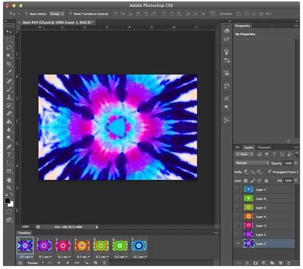 Ahora abre tu GIF en Photoshop (o similar). Aviso un par de cosas: las múltiples capas en el panel de capas de lado derecho inferior y el panel Línea de tiempo en la parte inferior de la pantalla. El Gif es animado por una serie de imágenes de la colocación, en este caso cada capa esté visible para 1/10 de segundo. Los ojos junto a una capa indica que la capa es visible, el cuadrado indica que se oculta. En la imagen, capa 1 es visible, y se ocultan todas las capas. En la línea de tiempo puede ver el orden de los fotogramas de animación, y que cada uno es visible.1 segundos. Si haces clic en cada uno de los cuadros, verás una imagen distinta es visible y el resto son invisibles. Por debajo de la línea de tiempo, dice para siempre, que esto significa que la animación se bucle continuamente para siempre.