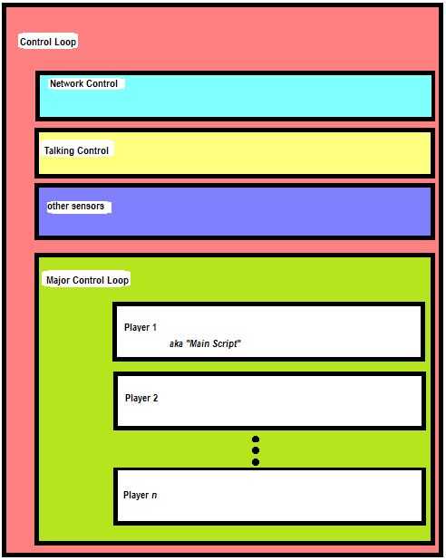 Control de la red, hablando de otros sensores y control es donde se procesan elementos ambientales externos. El lazo de control principal es donde ocurren las acciones con secuencias de comandos. (Y tener cuidado al llamarlos guión acciones, ya que algunos de los comandos al azar acciones para que ocurrieran). Después de un tratamiento, hay un puntero a la matriz donde comienza la secuencia de comandos principales (cada show debe tener un script principal). Ejecución comienza. Cualquier acción que se solicita, el programa Salta a la sección correspondiente del código y ejecuta. (Para los avanzados, esto se hace con el Select... Estructura del caso.) Cada instancia paralela de una secuencia de comandos se llama un jugador (como hilo, proceso, etc...)