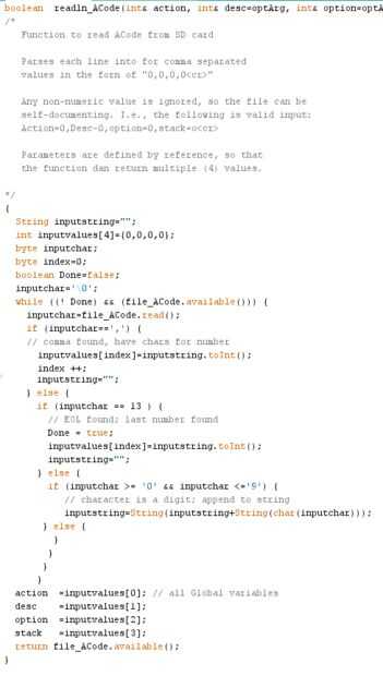 Esta función Lee los valores token de un programas de un archivo en la tarjeta SD y cargas en el programa los arreglos de discos (ScriptAction, et.al.). También se define por lo que acepta los parámetros por referencia, por lo que pueden devolver todos los valores de leer. Se utiliza para leer el código!