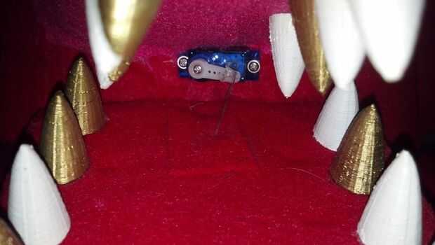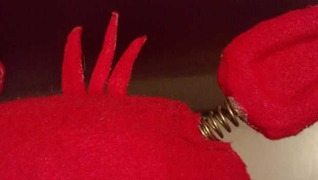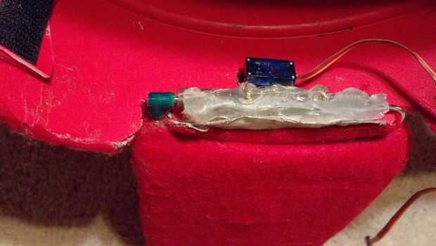 La mandíbula inferior de Foxy se hizo con otra percha doblada en forma de U cerrada a través de un tubo de lápiz dentro de la maceta base. Espuma se añadió más tarde alrededor de la percha y conducto grabado completamente para fieltrar. También debe tener un clip con ultraguay alambre atado alrededor de él para uso posterior con el servo. Hablando de eso, la parte posterior de la mandíbula de Foxy que es un orificio pequeño para caber un micro servo conectado a dicho ultraguay. Pegado ultraguay Horn servo (la pieza blanca) que le caiga alguna vez, pero deja el tornillo de ajuste.