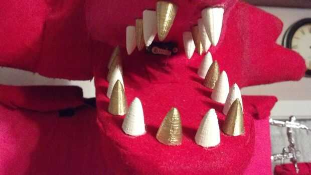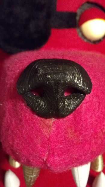 Todo el crédito va para él para el diseño de la máscara, la mía se acaba de cambiar para adaptarse a mis necesidades. Usé el mismo proceso, excepto cortar el coche de la mandíbula superior esponja diferentemente y adjuntas la mandíbula de una manera diferente demasiado. Los dientes y la nariz eran 3D impresos y pintados según los dientes de Foxy con aerosol. Usé una nariz hecha por Tioh en Thingiverse.com aquí http://www.thingiverse.com/thing:1131844 (también podría utilizar el modelado de arcilla en lugar de impresión 3D).