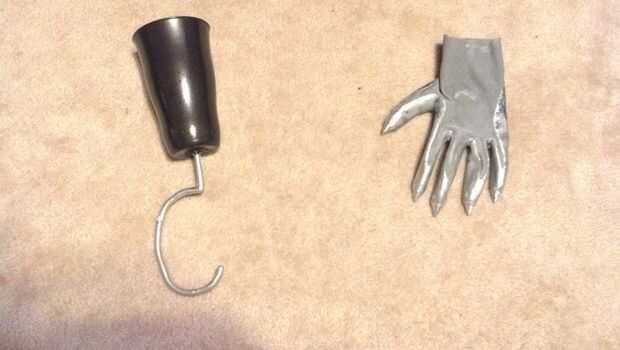 La mano fue un guante de aerosol pintado tela con algunas adiciones. Había dejado sobre los dientes que eran algo más pequeños que los demás, así que cortar las puntas de los dedos en el guante y se deslizó dentro crear las garras. La pieza en la parte superior es el tablero de la espuma con pegamento caliente más como detalle. Sugiero no pintura un guante como lo hice y en su lugar comprar o hacer uno. La pintura de aerosol se frotará lentamente de la mano con demasiado movimiento.