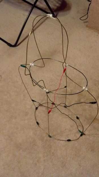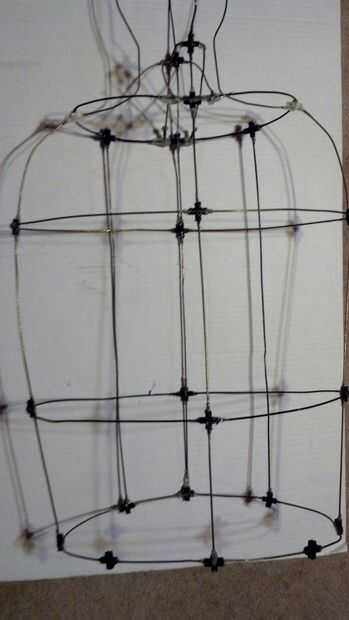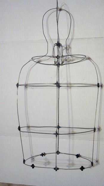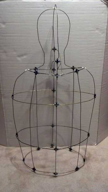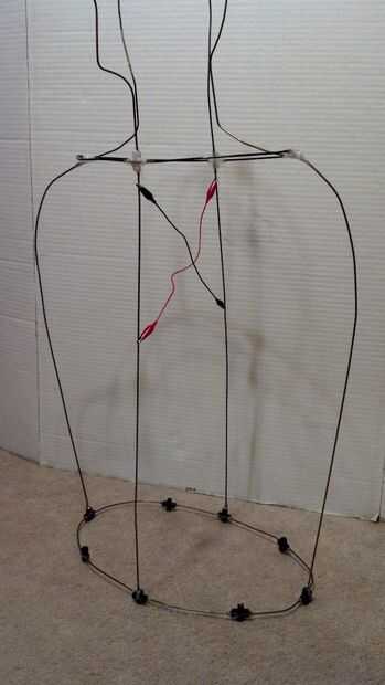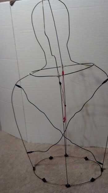 - Conecte la cabeza y la cintura con cuatro perchas para hacer una estructura general. Utilizando otros objetos y personas para sostener la jaula del pecho hace esto más fácil