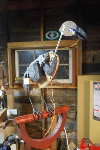 El cuerpo se basa en una pieza de contrachapado corte al contorno del cuerpo con cortes para el tubo de aluminio y servo de cuello que sirve como el eje del cuello. Abultado del cuerpo con pedazos de material que encontré fue cortar fácilmente con una sierra pequeña o las tijeras y no arrojar piezas como espuma de poliestireno del embalaje de la espuma negra. Los tubos de la pata fueron insertados en los bloques de madera Unidos al base de cuerpo de madera contrachapada.