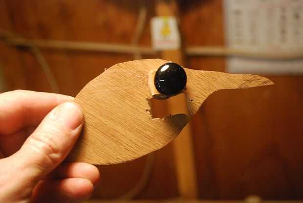 La cabeza se basa en una pieza similar de madera con una abertura para el servo del pico. Para unir la cabeza al eje del cuello, corte y flatted el tubo de aluminio se ajuste alrededor de la madera contrachapada. Después de la alineación que se vea natural, atornilla el tubo aplanado. El pico más bajo fue unido al servo. Los granos de cristal utilizados como ojos estaban pegados a los bloques de madera colocados en el cabezal de madera contrachapada base para darles el espacio adecuado. La separación de los ojos, encontré, dictado el ancho de la cabeza. La cabeza fue entonces abultada hacia fuera con la espuma de embalaje también.
