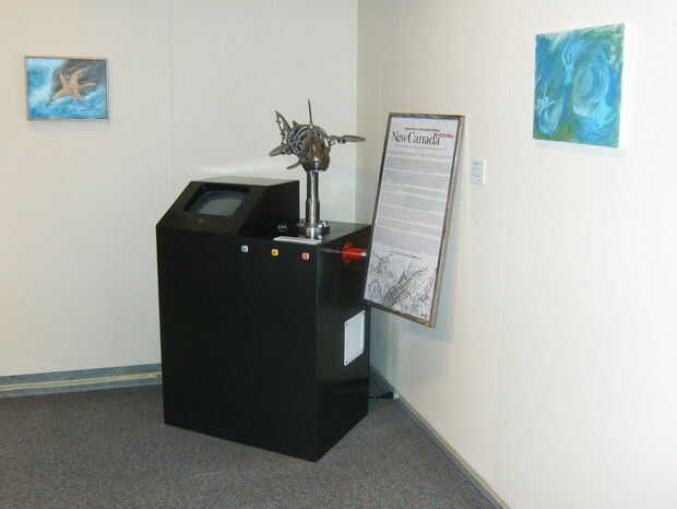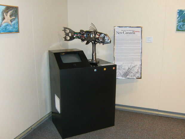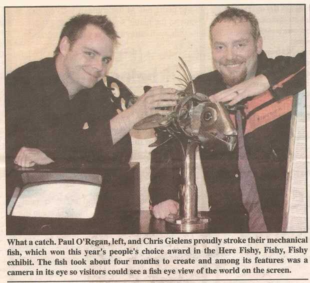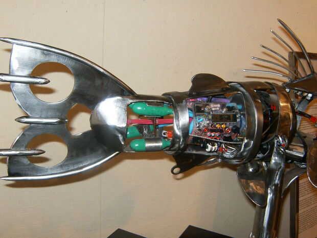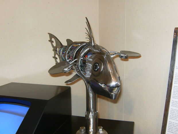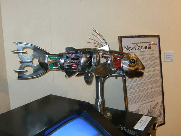 Este es mi pez de animatronic - Eoz 7 del proyecto V'Ger, que he construido para el Museo local aquí en Kitimat, BC. Tenía un concurso para presentar cualquier obra de arte que fue pescado relacionada. Durante años fue siempre lo mismo, colores del agua de pescado escenas, el tejido o la extraña escultura. La mirada allí era inestimable cuando nos ruedas esta monstruosidad en vino primer premio como "Pueblos Choice Award". La historia detrás de los peces es que es realmente el futuro, bien los futuros últimos de todos modos, todavía nuestro futuro aunque... molesto-charla-paradoja de tiempo! La historia cuenta que este pez era un experimento ido mal. Durante su despliegue con sus parientes una noche, una riada elimina el científico y otros peces robo excepto éste. Cree la pérdida, la búsqueda fue abandonada. Nadie sabía estaba ocupado circunnavegaba el globo varias veces antes de volver al lugar de sus orígenes. Aquí se encontró siendo impulsadas sobre la orilla por un grizzly hambriento. Ahora poner en exhibición para el pueblo de 2036AD.