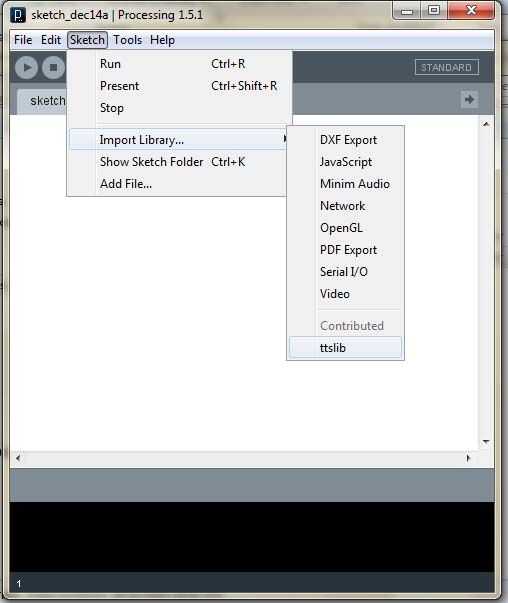Descargar el archivo y simplemente lo descomprimimos en la carpeta de las bibliotecas en su sketchbook. Una vez hecho esto, procesamiento abierto y usted debe poder ver ttslib si pinchas en dibujo - biblioteca de importación en el menú. Si usted no puede verlo allí volver y vuelva a intentarlo. (Cerca de procesamiento entre intentos)