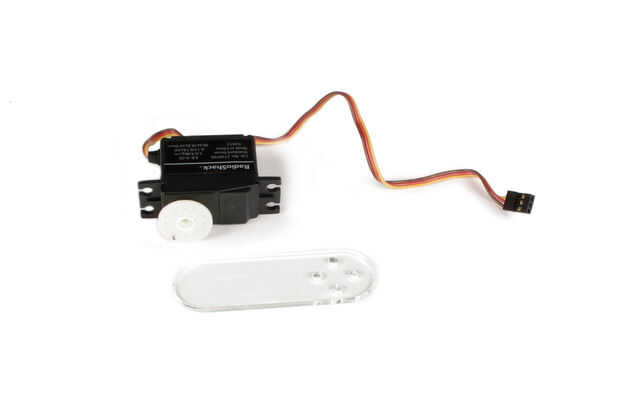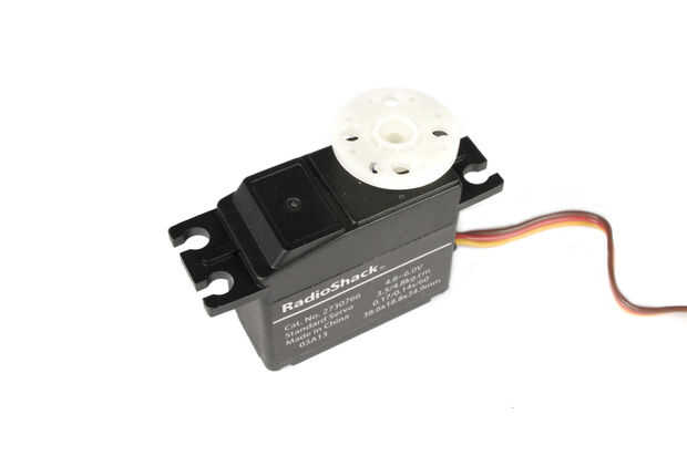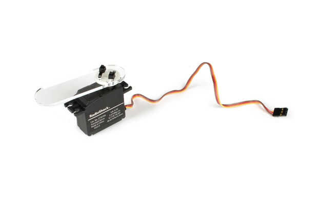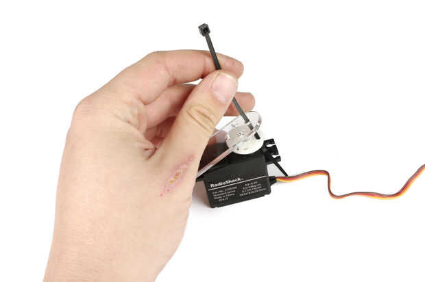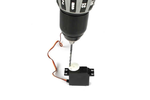 Taladro de dos pares de orificios de 1/8" a lo largo de la parte exterior del cuerno del servo, tal que alinee con los agujeros en la palanca de plástico transparente.