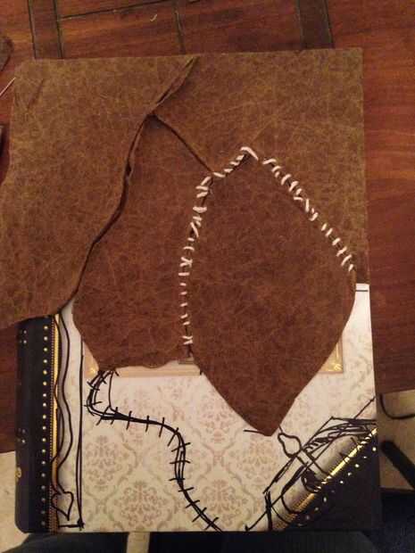 Repita la técnica de imitación de cuero en dos trozos pequeños de papel para utilizarse como los párpados. La mejor manera que encontré para pegarlas es doblar una porción y pegar el papel a sí mismo para crear un bolsillo. Puede que necesite cortar dardos los párpados para dar más de una forma curva.