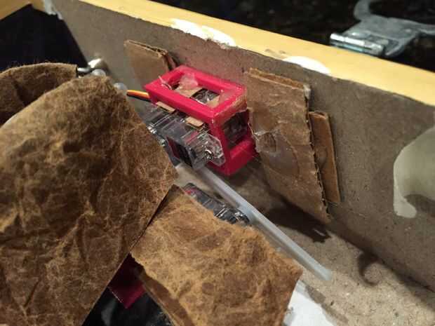 Coloque los servos en los soportes del servo impreso. Taladre un orificio en el extremo (más grueso) del soporte del servo en el centro. Conecte el servo tilt al servo de abrir y cerrar con unas arandelas y un tornillo. El tilt servo y servo de parpadeo deben ser uno frente al otro. Para evitar que el servo de inclinación por el mismo camino, acabé pegado cartulina dos "rieles" en otro lado del servo tilt.