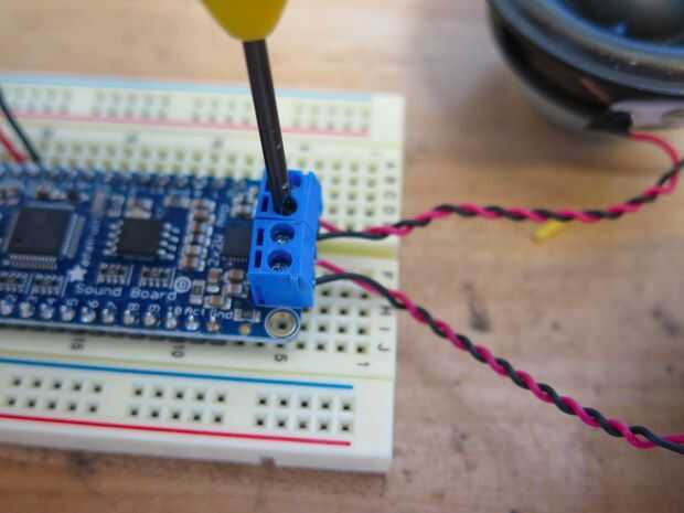 La placa con 5V de alimentación. Aquí uso una fuente con una corriente máxima de 1A. Asegúrese de que el cable rojo está conectado a Vcc y tierra es conectado a tierra. Ahora permite conectar los altavoces, Compruebe la parte inferior de la tabla para asegurarse de que usted se lo montan los cables positivos y negativos adecuados para los altavoces.