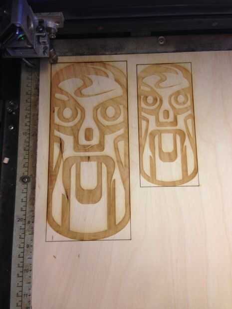 Usando un cortador láser de Epilog grabada la cara de tiki en madera contrachapada de 1/8" y corte el perfil. Si no tienes un cortador láser dibujo cara de tiki en balsa de madera, cortando con un cuchillo X-acto funcionará igual de bien. He unido a un archivo de Illustrator con dos Tiki diferentes tamaños de la cabeza sólo en caso quisiera escalar hacia arriba o abajo el diseño.