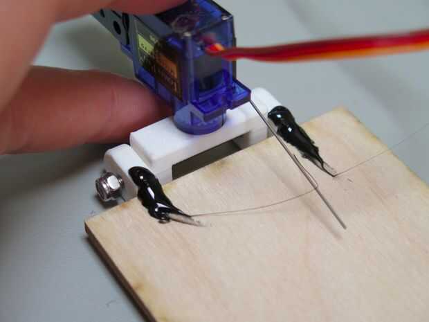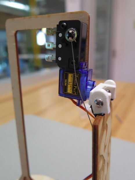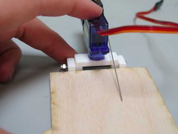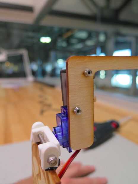 La cara de tiki en la cuchara de la bisagra la pistola de pegamento caliente y aplique una tira a lo largo de la parte posterior de la guardia de tiki. Ahora toma el conjunto de servo e interruptor y alineados con los orificios en el soporte. Enrosque los tornillos M2.5 a través de ambas piezas y tapa apagado con una tuerca.