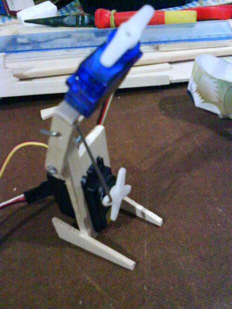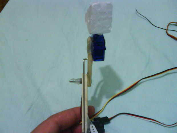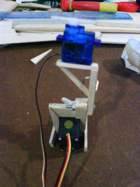 El esqueleto se hizo con dos servos, pedazos de madera de balsa, un perno, una tuerca y una varilla de acero.
