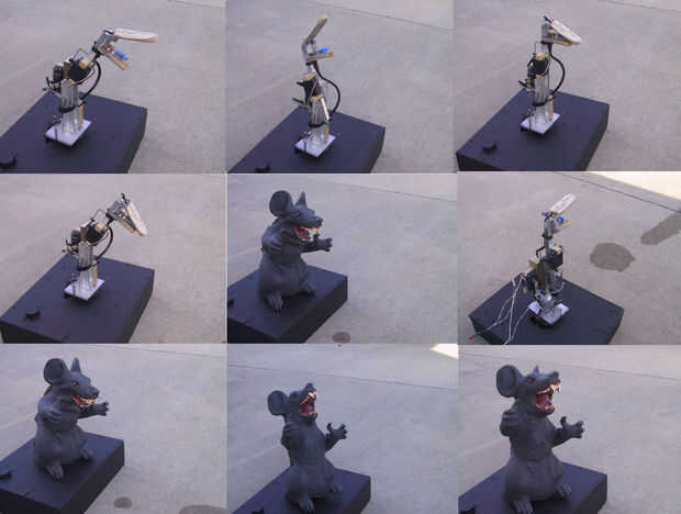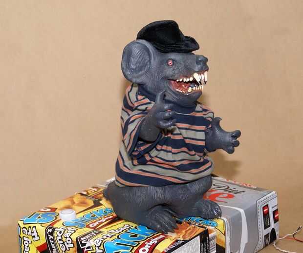 Esta rata puede moverse en su lugar, hable con un micrófono inalámbrico y escupir ácido (realmente sólo agua). Los vídeos para ver cómo se mueve.