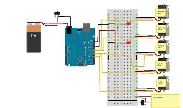 Esto funciona muy bien para esta aplicación pero siéntase libre de utilizar cualquier Arduino quiere-ahí es diagramas que muestra cómo de alambre de cualquier manera. El citado instructivo muestra cómo crear, programar y usar la placa de control Arduino estoy usando. Los servos son alimentados por cuatro pilas recargables "AA". Pienso montar pequeños interruptores para las pilas "AA" y la celda de LiPo para que sea fácil de encender y apagar.