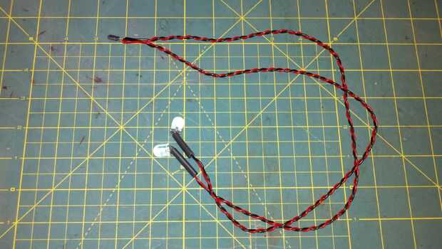 Cada LED de 10mm tiene una resistencia de 100 Ohm soldada a su positivo y entonces están cableados en paralelo. Los LEDs se pegan en la corte por los titulares de LED en los zócalos del ojo cabeza usando una pistola de pegamento. Estos deben pegar después de que el casco está pintado.