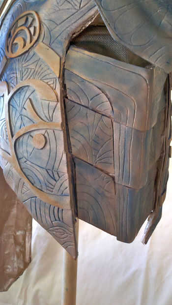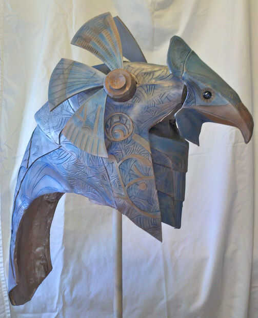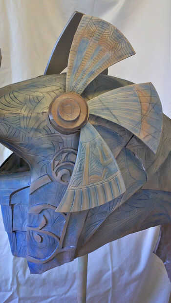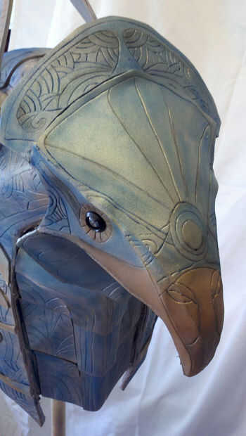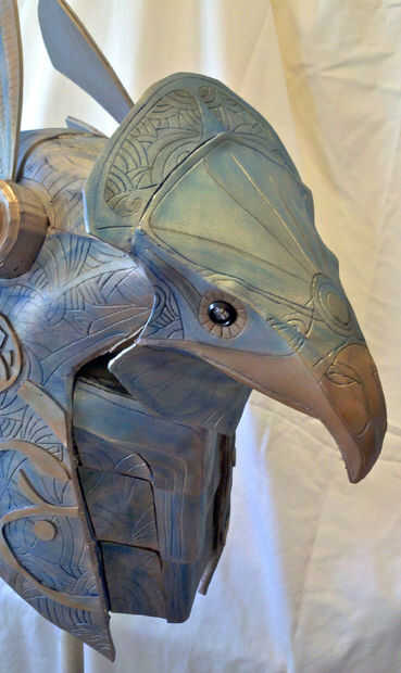 Al pintar este le primero di una capa de selladora Minwax Polycrylic usando un cepillo grande para sellar la espuma y evitar que la pintura de aerosol que se dañe. Entonces roció la plata casco y ventiladores. Esto fue seguido por una capa de cobre sobre la sección del pico de la cabeza y la parte inferior del casco.