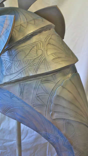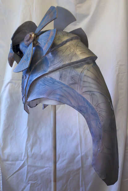 Pintura fue seguida con algunos trabajos de pastel. Fui por primera vez sobre el casco con algún polvo pastel azul marino (raspó el palo pastel con mi cuchilla multiherramienta para hacer polvo) con un pequeño pincel suave y un hisopo de algodón para mezclarlo. Zonas de cobre se resaltan con un palito de pastel marrón rojizo y que fue mezclado en el uso de un hisopo de cepillo y algodón. Polvo negro pastel fue aplicado alrededor de las líneas de detalle a añadir alguna definición. Finalmente el casco entero fue dado una capa transparente satinada y estaba listo para ir!