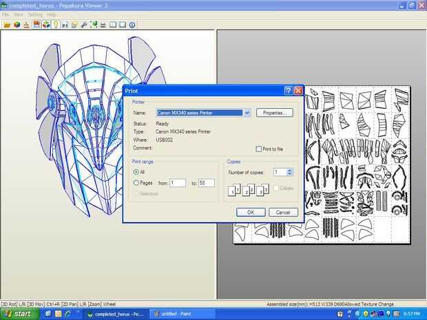 Ahora seleccione el icono de impresora, seleccione la impresora, seleccionar todo y luego en Aceptar. Una ventana aparecerá pregunta si usted si desea ajustar el no selección de escala. La razón de esto es que Pepakura Viewer está configurado para imprimir en papel A4 y si usted escala el modelo para que quepa en papel de tamaño de la letra los patrones será el tamaño incorrecto. El lado negativo de esto es que si va a imprimir en papel tamaño carta algunos de los patrones pueden ejecutar apenas fuera de las fronteras, pero no es gran cosa.
