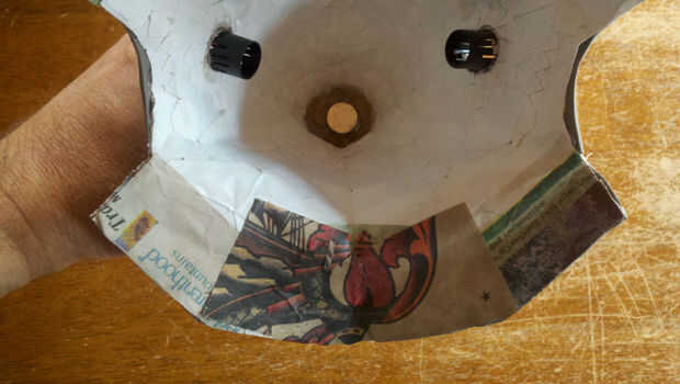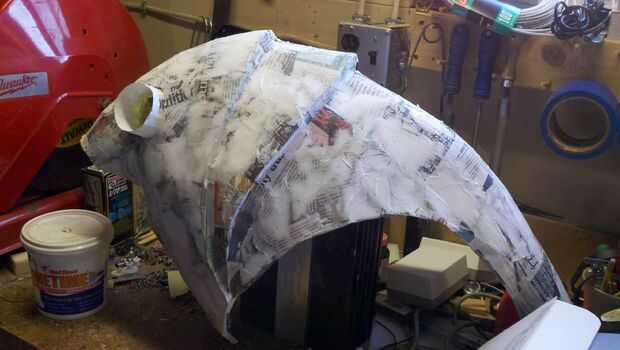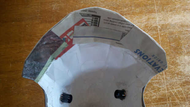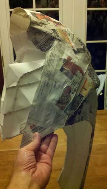 La cáscara de la cartulina es bastante endeble por lo que debemos reforzar con algunas capas de papel maché. Usé pegamento blanco con un poco de agua para facilitar el cepillo en. Sólo rasgar algún periódico en pequeños pedazos, unte el pegamento en la cartulina usando un cepillo pequeño y comience a pegar el periódico. El truco aquí es no hacer demasiado grande un área a la vez o conseguir demasiado mojado-esto ayudará a evitar deformaciones. La cabeza también requiere papel maché el interior cerca de los bordes posteriores en la parte superior e inferior. Esto evitará que los bordes que se encrespa.