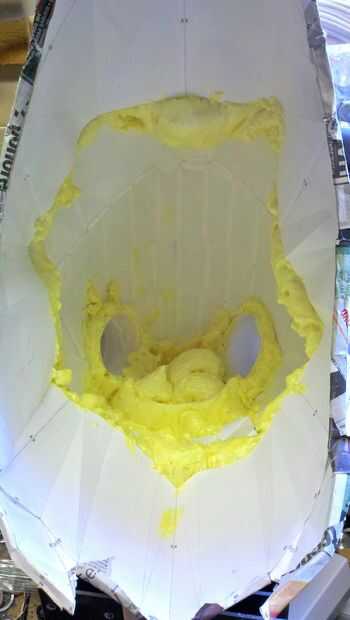 Al completar la parte superior del casco, cubre el orificio grande con cinta para evitar que la espuma que exuda hacia fuera que embala. Después de que había curado la espuma, corté el orificio de acceso para los cables de servo con mi pequeña mano Sierra - sólo a través de jab para hacer un buen tamaño a través del orificio. También puede utilizar la sierra para recortar el exceso espuma en el interior del casco y la cara frontal de la abertura grande (después de quitar la cinta de embalaje).
