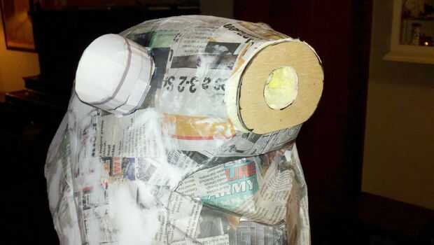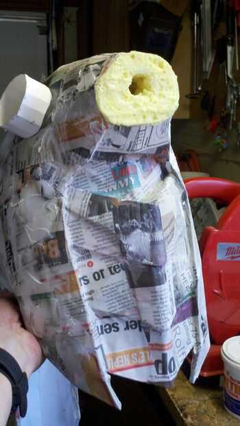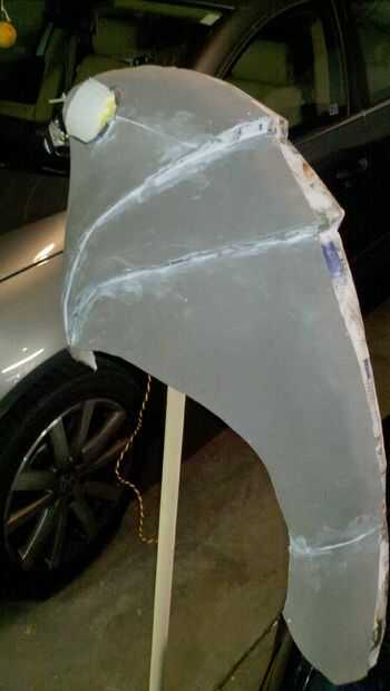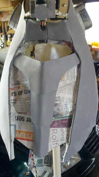 Con cada capa adicional (yendo de cartulina doblada para papel mache/plaste espuma piel) intenta alisar la superficie y reducir la apariencia de las líneas de doblez del patrón original. La piel de espuma simplemente le da una buena capa externa que tiene un aspecto uniforme y permite poner las líneas de detalle en.