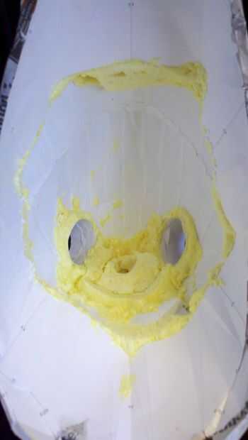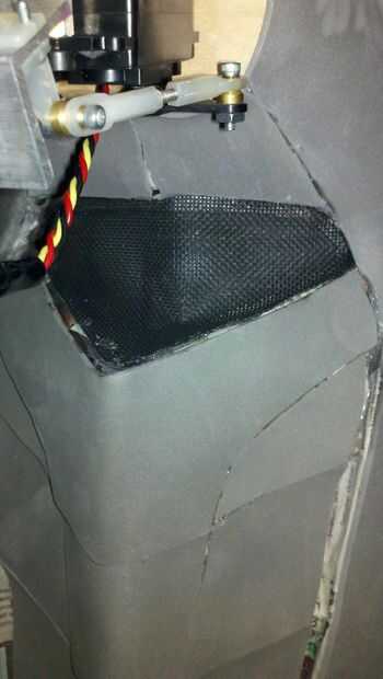 Usé aerosol espuma en el interior del casco para rellenar el área alrededor de la parte superior donde se fija la cabeza y alrededor de los tubos del ventilador y cavidades en los costados y parte trasera del casco. Esto agrega mucha rigidez al casco y le da algo sólido para pegar la cabeza de madera placa de montaje. Sólo desea rociar en un poco en un tiempo y luego dejarlo curar, sobre todo en la parte superior del casco. Si usted intenta hacerlo todo a la vez sólo la espuma en las superficies exteriores se curan y vas a tener un lío pegajoso cuando vayas al orificio de acceso para los cables de servo.