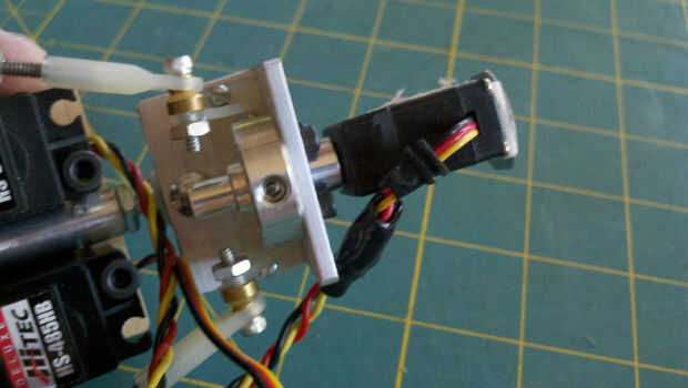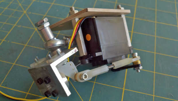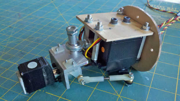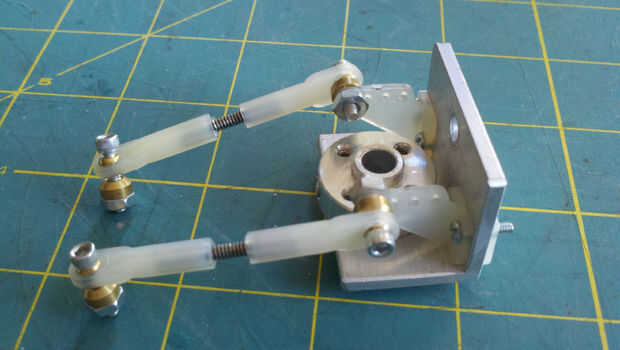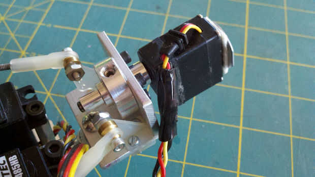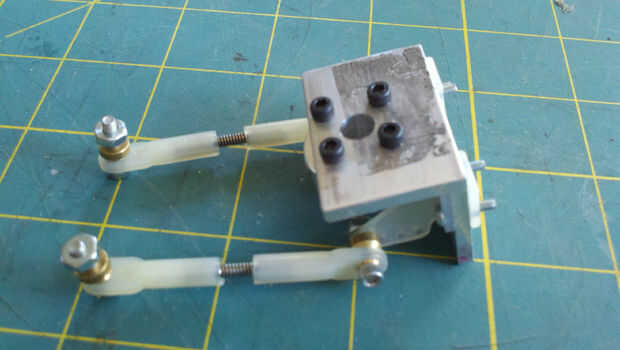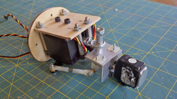 El mecanismo principal consta de dos servos que se mueven un tercer servo en un cojinete esférico (extremo de la barra.) Es muy fácil de construir y es bastante compacto. Sobre todo utilizar servos Hitec y han quedado muy contento con su rendimiento y durabilidad. He utilizado dos servos de tamaño estándar de Hitec HS-485HB para los servos principales y un servo micro Hitec HS-80 en la parte delantera (el mismo servo HS-80 se utiliza en el mecanismo del ventilador). Lamentablemente estos servos no están disponibles a partir de esta escritura por lo que sugiero usar los servos de tamaño estándar HS-425BB menos costosos y el servo micro Hitec HS-81. Si desea utilizar servos de calidad/más fuerte mejor entonces por todos los medios hacer para ti sin duda dolerá. Si ese es el caso recomiendo el servo estándar HS - 645MG y servo micro HS - 85MG-éstos son ambos servos muy fuerte/artículo para el dinero. El micro HS - 85MG tiene la ventaja de engranajes del metal y los rodamientos de bolas en comparación con la micro HS-81 asi que mejor apoyan la cabeza.