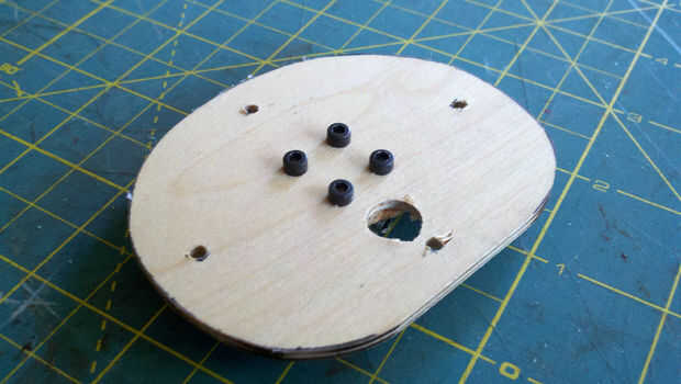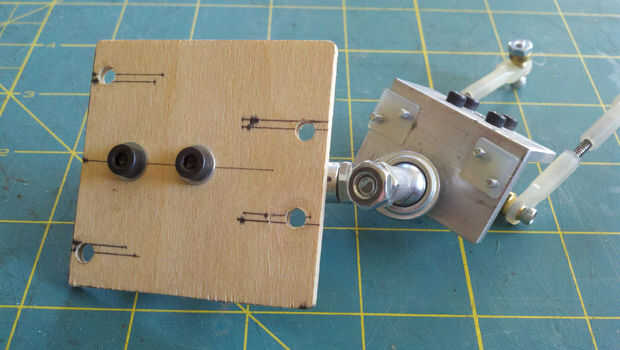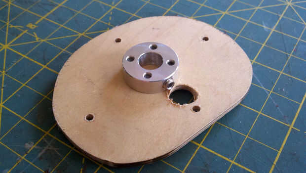 Lo primero que quieres hacer es la placa base. Usa la segunda pieza de madera contrachapada que coincida con la pieza en la parte superior del casco. Un cubo de aluminio con un orificio de 3/8" se emperna a esto y se perfora un orificio de acceso para los cables de servo en el centro. Ahora corte un trozo de varilla de aluminio de diámetro 3/8" a 2 1/4" longitud. Taladro y golpee un extremo para el extremo de la varilla de 10-32. Perfore dos orificios espacian aparte en la parte superior de la varilla de 5/8" y montar dos separadores 1/2" largo.