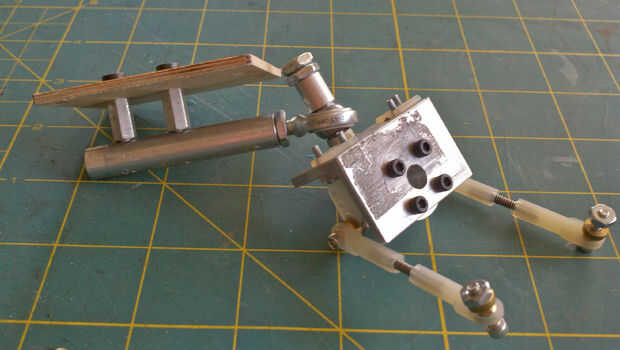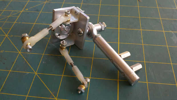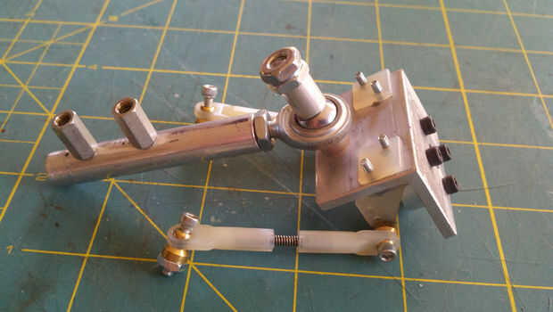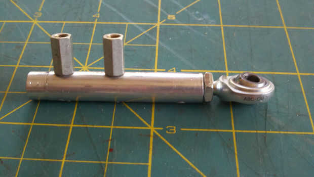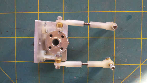 Para el tercer servo montaje corte un pedazo de ángulo de aluminio de 1" a 1 1/2" longitud. Perfore un orificio de 1/4" en la parte delantera y montar el cubo de aluminio de 1/4". Taladre un agujero para un tornillo 10-32 en la otra cara. Taladre los agujeros para los balancines de control y montar como se muestra en las fotos. Hacer los enlaces de control por corte dos pedazos de varilla de 4-40 1" longitud y luego enhebrar en los enlaces de bola giratoria hay un espacio de 1/4" entre ellos. Montar un extremo de cada eslabón giratorio para los balancines de control. Tendrás que perforar el orificio en el cuerno de control ligeramente para pasar el tornillo. Ahora coloque el tercer servo montaje en el extremo de la varilla con un 1 1/4" Perno largo 10 32 tal como se muestra en las fotos y asegure con tuercas para no soltarse. Si lo desea puede utilizar un tornillo más corto (sólo tenía éste por lado) y he hecho algunos espaciadores utilizando chatarra de tubería de aluminio. Usted querrá usar algunas pequeñas arandelas o separadores en este perno para obtener movimiento completo cuando la inclinación longitudinal.