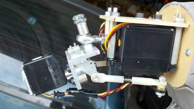Ahora tiene que montar los servos principales. Usé algunos separadores 1 3/16" largo (dos por servo) y había montado los dos servos a una placa de madera contrachapada fina. La placa de madera contrachapada entonces los pernos a los separadores de dos en la barra de aluminio de 3/8". Ahora conectar los enlaces giratoria a los dos servos. El tercer servo se monta en la parte delantera con una 1/4" diámetro servo salida extensión del eje. Probablemente tendrás que cortar el tornillo de montaje un poco como hice para conseguir que queden bien el servo pequeño. Conecte un cable de extensión de servos para este servo delantero por lo que será capaz de alcanzar todo el camino a través del orificio de acceso en la placa base. Me corte un pequeño trozo de hoja de acero de chatarra y adjunta a la parte delantera del servo con cinta doble cara espuma. También quité las lengüetas de montaje de la carcasa del servo hacia adelante para conseguir el servo como cerca del frente del interior de la cabeza como sea posible.