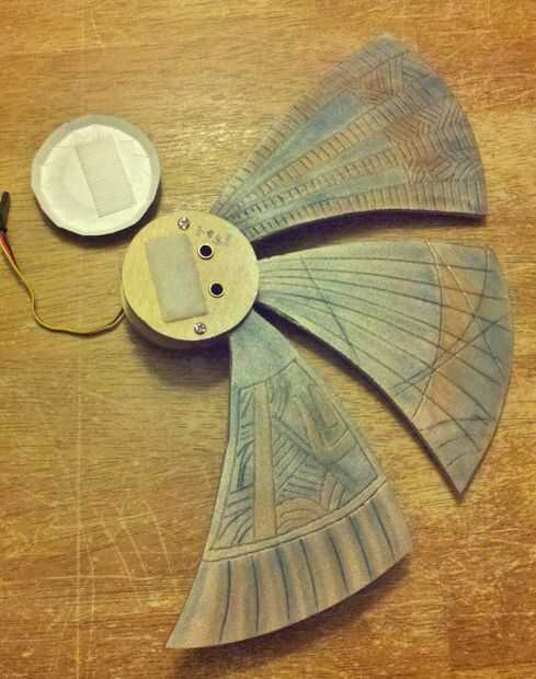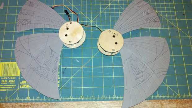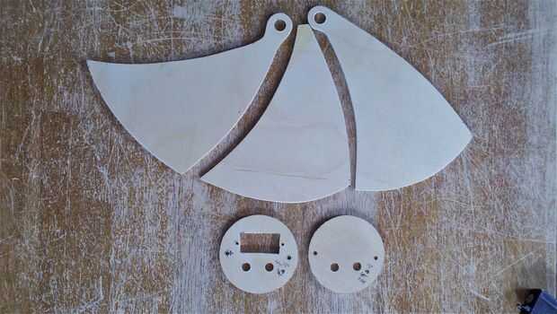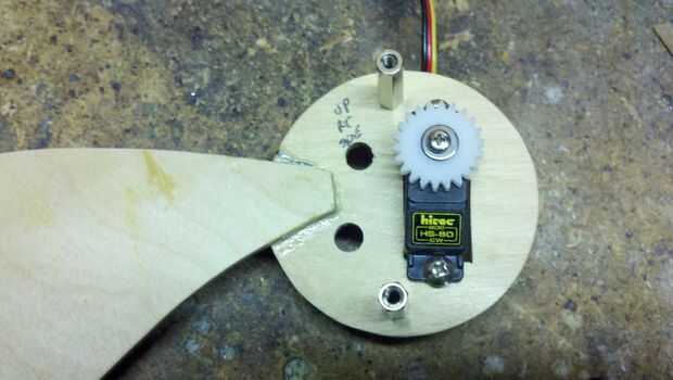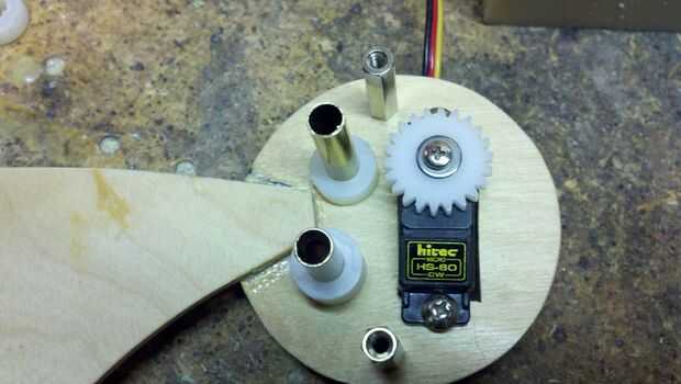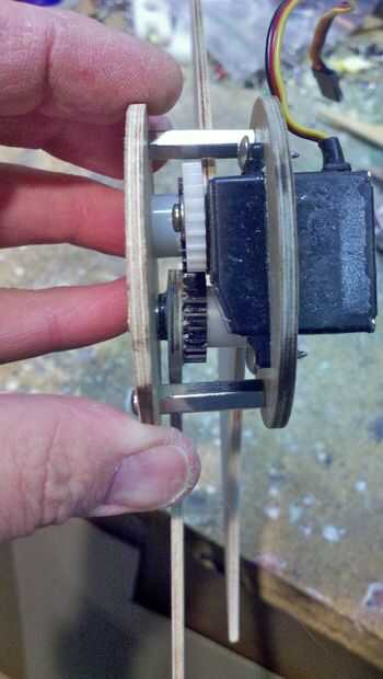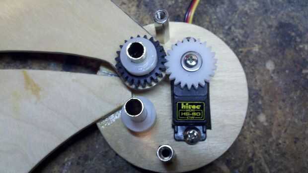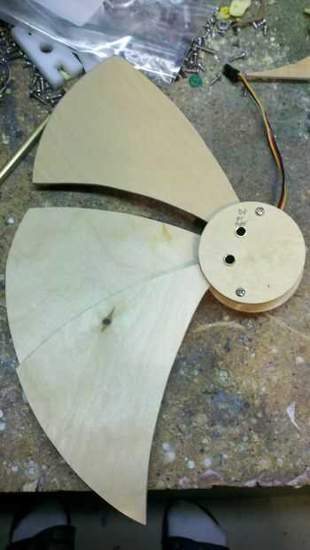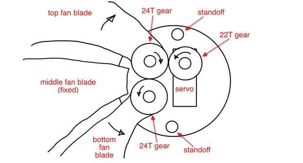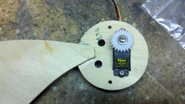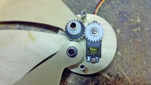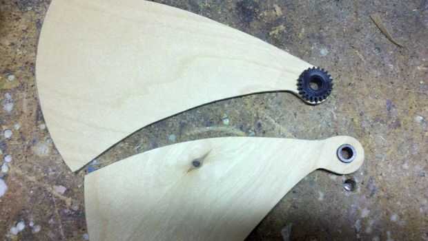 Tomar uno de los discos de madera y cortar un agujero para montar el servo. Se reflejan las placas de montaje de servo de lado derecho e izquierdo. Monte el engranaje de 22T al servo y luego pegar las aspas del ventilador centro fijo en su lugar con pegamento del gorila. Ahora colocar la parte superior y parte inferior de las aspas del ventilador en la placa de montaje de servo, manteniendo los engranajes en la alineación que acoplamiento con cada otra marca su posición. Se nota que las aspas del ventilador superior del engranaje por servos engranajes y el engranaje de la lámina inferior ventilador se activa por el engranaje de la lámina del ventilador superior. El engranaje de la lámina inferior ventilador no entra en contacto con el engranaje del servo.