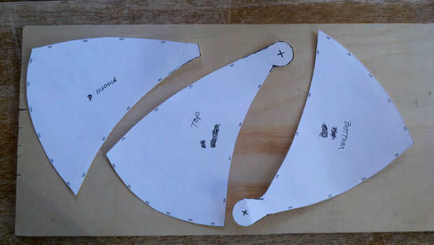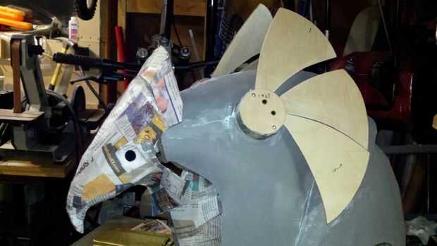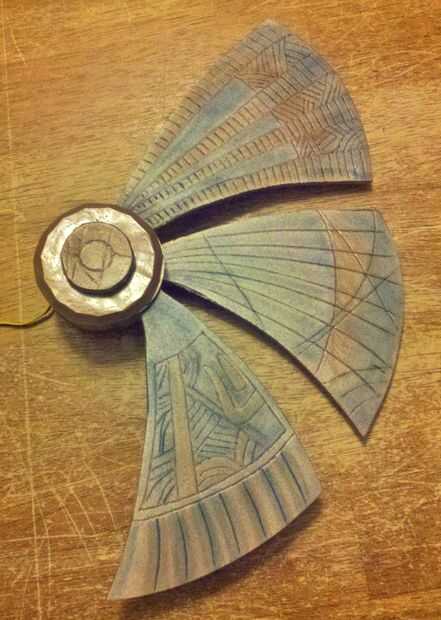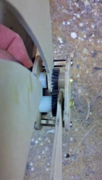 Para construir el mecanismo primero cortar cuatro discos de madera contrachapada para el ventilador, montaje de tubos en los costados del casco debe encajar bastante cómodamente. Ahora corte las aspas del ventilador de la hoja de madera contrachapada fina. Las aspas del ventilador centro es igual a la plantilla pero las cuchillas superiores e inferiores necesitan extensiones pequeñas con agujeros de 3/8" para permitir el montaje de los engranajes 24T. Los engranajes de diámetro 1/4" son prensa de ajuste y pegado en los agujeros de las cuchillas superiores e inferiores con pegamento del gorila. Sólo Haz primero la humedad de la madera, Aplique pegamento en la parte trasera del engranaje y en su lugar en las aspas del ventilador. Mayo un poco de pegamento en los dientes del engranaje durante el curado la espuma-a recortar distancia usando un cuchillo X-acto.