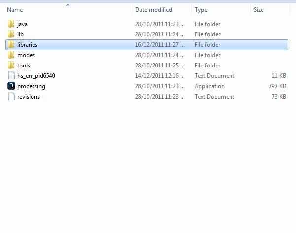 Empezar por descomprimir en la carpeta donde está instalado procesamiento en una carpeta llamada bibliotecas. Se necesita crear la carpeta "libraries" en las versiones más recientes de procesamiento como bibliotecas normalmente se instalan en la carpeta de las bibliotecas en su sketchbook.