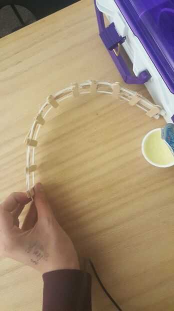 Una vez que se construye el esqueleto, puede Agregar el elemento de animatronic. Para ello, corte de sección de 1 pulgada de la paja de café fino, luego pegar en el interior del tentáculo (frente a lado de la "espina dorsal"). Luego pase la cadena a través de la paja, atar y luego pegando en el lugar en la parte superior y luego dejar algunos sueltos en la parte inferior. Por último, con cinta adhesiva la paja a los palillos de la columna vertebral para que permanecerá en su lugar!