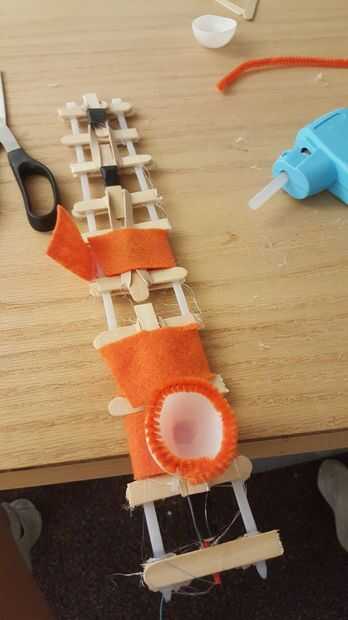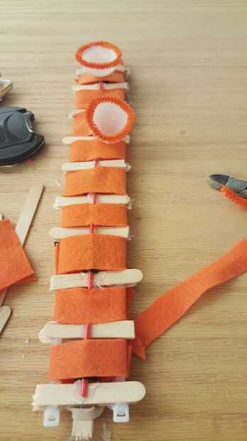 Para que se vea más tentacle-esque, cortar tiras de fieltro de colores (utilicé naranja pero figura verde o azul incluso también ves bien!) y caliente entre los palitos paralelos. Luego corte el ping pelotas de ping-pong por la mitad. Limpiador de tubos de pegamento alrededor del borde del mitad ping pong bolas, luego pegamento caliente las bolas en el interior de los tentáculos!