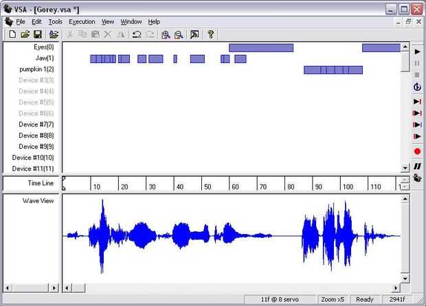 VSA tiene una herramienta muy útil llamada "Análisis WaveMotion" que automáticamente puede generar eventos del volumen de un archivo de audio (por esta razón que guarda cada voz en su propio archivo de wav). Carga de cada pista de la voz y generar eventos de control para el servo adecuado.