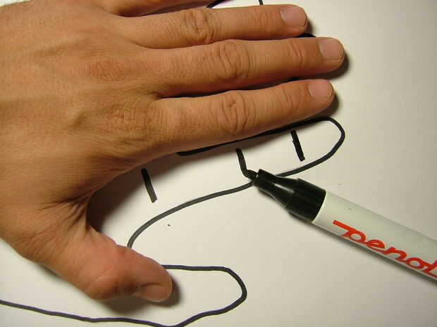 En primer lugar, dibujar un contorno de su mano en una hoja de papel. La marca de las articulaciones de cada dedo incluyendo tus nudillos. Si eres perezoso, solo imprima la última foto:)