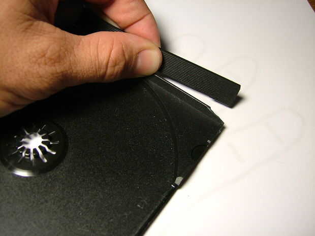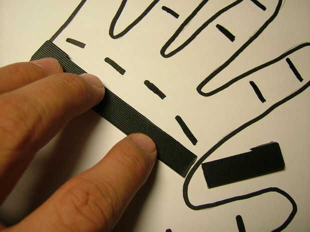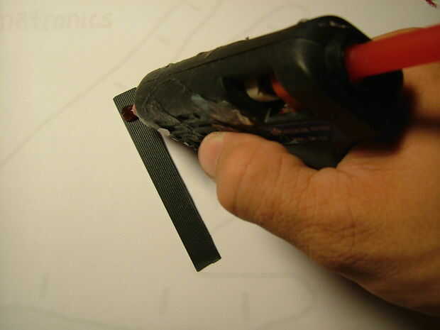 Hacer uso de esas viejas carátulas que bloquea tu escritorio y broche de presión una pieza de plástico. Corte al tamaño y encienda la pistola encoladora. Pegue los dedos a la tira de plástico (justo debajo de las articulaciones de los nudillos). Asegúrese de que los dedos de la derecha están en el lugar correcto!