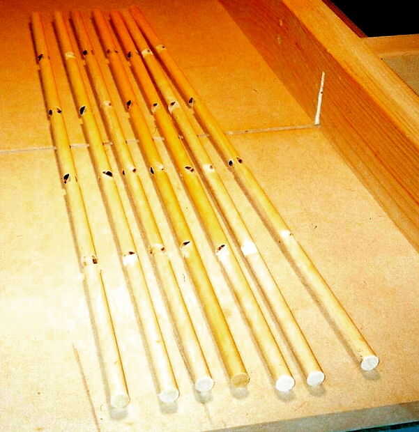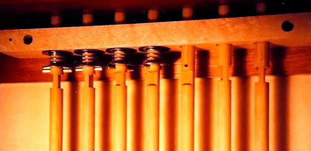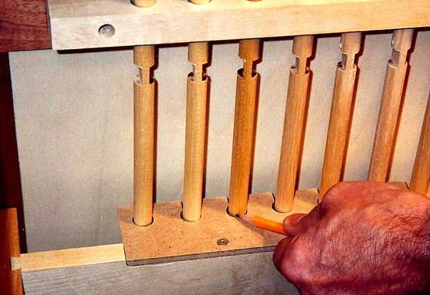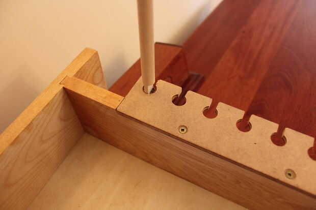 La combinación de las barras de bloqueo y las placas de varilla cerradura en los cajones debe, en teoría, completar el sistema de cierre y presentar tantas combinaciones adivinar que el correcto (o dos) sería bastante imposibles. Sin embargo, debo mencionar que se trata de 2 generación de esta combinación madera sistema de bloqueo. El primer gabinete tenía bastante bien un sistema idéntico a éste en cuanto a las barras de bloqueo y las placas de cerradura barra - pero no pasó mucho tiempo para el hijo número uno encontrar la manera de vencer el sistema. Mediante la aplicación de una luz tirando en la manija del cajón como usted tuerce lentamente cada varilla cerradura, usted puede eventualmente "sentir" la presión como de la línea de pisos de varilla hasta con las aberturas de la placa cerradura barra. Para superar esta deficiencia en la versión actual del gabinete, un articulado 'lock cubierta rod' con un acoplamiento a un pernos que encajan en un surco de ángulo recto a ambos lados de cada cajón con seguridad bloquea el cajón en su lugar cuando la tapa de la barra de la cerradura está abierta. Con esta configuración no puede torcer las varillas y tire de la gaveta para vencer el sistema porque cuando usted puede ver las barras para girar (tapa abierta), los cajones son cerrados en lugar por los pernos. El video de arriba o aquí: http://youtu.be/jXR1rI32I5A hace más fácil de entender.