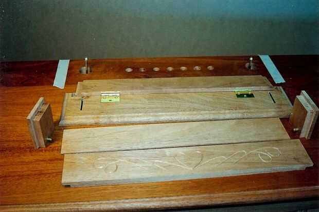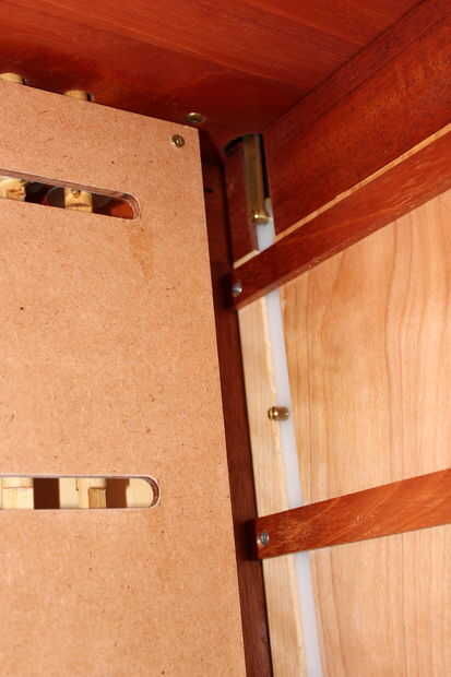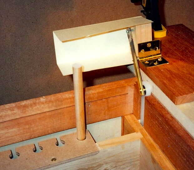 junté un par de maquetas como parte del proceso de diseño para la tapa de la barra de la cerradura y la vinculación de trabajo suavemente antes de la construcción final. Aquí se muestra una maqueta. Fui con barras planas de plástico para dar una libre acción de deslizamiento la fricción y para asegurar la estabilidad dimensional en el sistema con el tiempo. Los pernos de latón que son prensa montado en las barras planas de plástico son pernos de estante de gabinete de cocina.