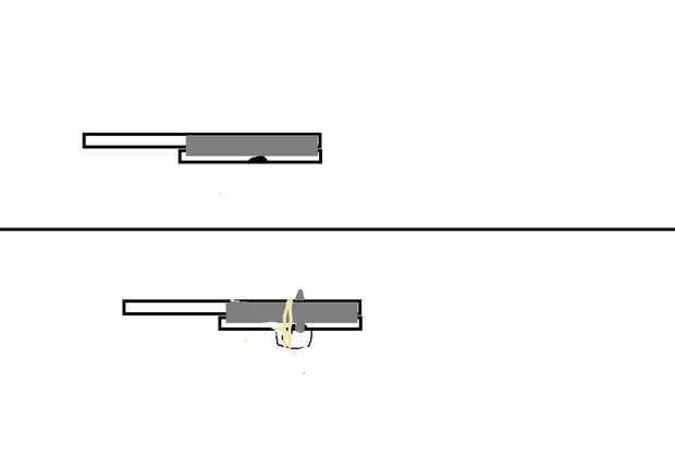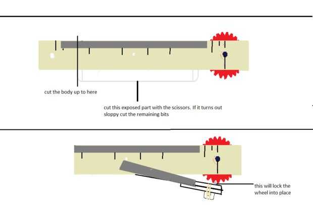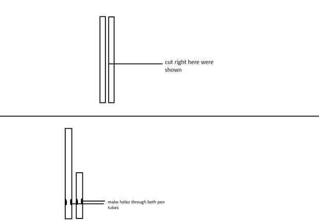 para hacer el gatillo necesita los tubos de pluma. línea de ambos juntos y cortar uno por la mitad como se muestra en la imagen. Luego hasta y hacer agujeros en los tubos. Luego con cinta adhesiva para que tanto partido del agujero. Después en la clavija clavo y guárdela junto con un band.then de goma fina, cortar la pieza expuesta de plástico. Ahora inserte los tubos de la pluma con la clavija clavo como shown.make que el clavo traba con el wheel.tape todo