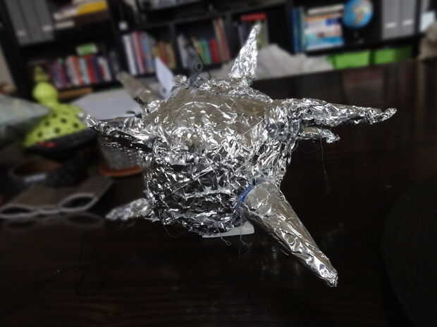 Tomar el papel de aluminio y hacemos una bola. Ahora usted puede agregar papel decoraciones como conos pelotas o cubos. Use pegamento para fijar los adornos a la bola principal. Una cadena en la parte superior de la bola del pegamento y pegar el otro extremo de la cuerda a la base (no importa donde pegue en la base).