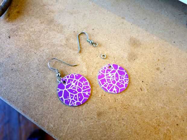 Añadir los anillos de salto a través de los orificios en la parte superior y luego añadir los ganchos. Asegúrese de que cada pendiente se cuelga para que el diseño quede hacia afuera.