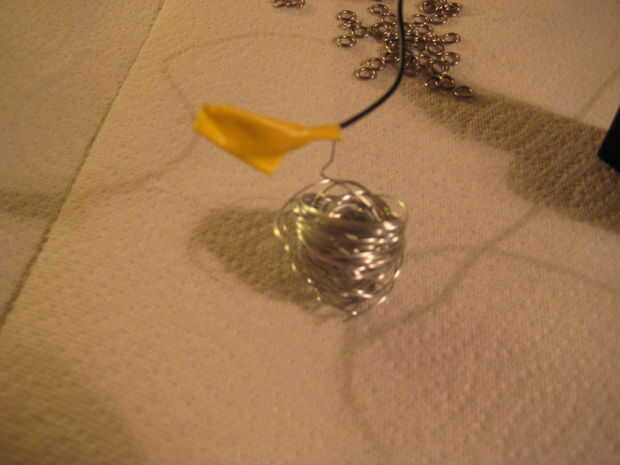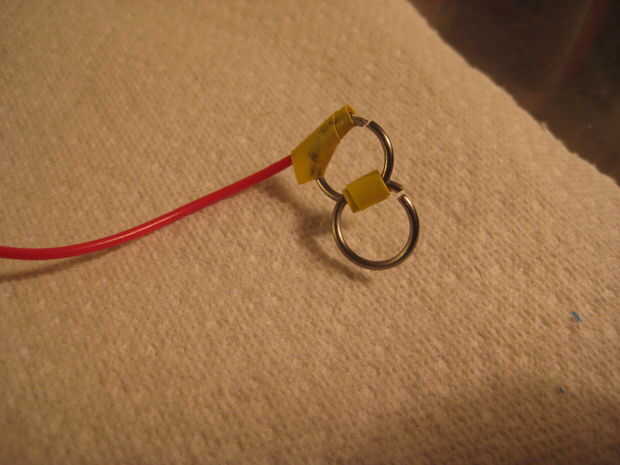 Abra un segundo anillo grande. En las fotos, lo tengo grabado en el anillo cerrado. Encontré que la cinta comenzó a caerse una vez que tienes mojado, así que más adelante que empecé a colgar el anillo abierto sobre el cerrado. Los anillos que desea anodiza colgaré este segundo anillo.