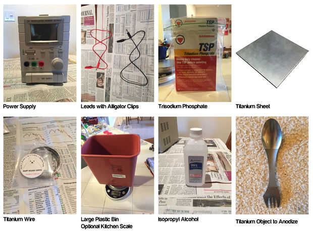 4. hoja de titanio: este es uno de los elementos más difíciles localizar. Básicamente, además del objeto de titanio que anodiza, necesitas otro objeto de titanio que tiene más superficie que el objeto original. No tiene que ser una hoja. En realidad, si vas a anodizar algo pequeño (como un anillo) puede sustituir una gran cantidad de alagodón alambre de titanio para la hoja de titanio como tiene más superficie que el anillo. El objeto que desea anodizado (en nuestro caso un anillo o un spork) servirá como el ánodo y el cátodo será el otro objeto de titanio con superficie más (en este caso una hoja de titanio o alambre wadded para arriba). Tanto de los objetos de titanio tendrá que encajar en tu papelera grande (pieza #6).