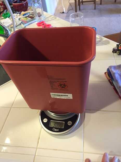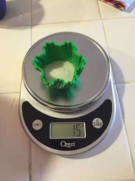 Puesto que un litro de agua pesa 1000g, pone a cero la balanza con el recipiente en él (no en la foto) y luego 3000g de agua (3 litros). Cero entonces la escala con una taza más pequeña en él (no en la foto) y luego agregar 15g de TSP.